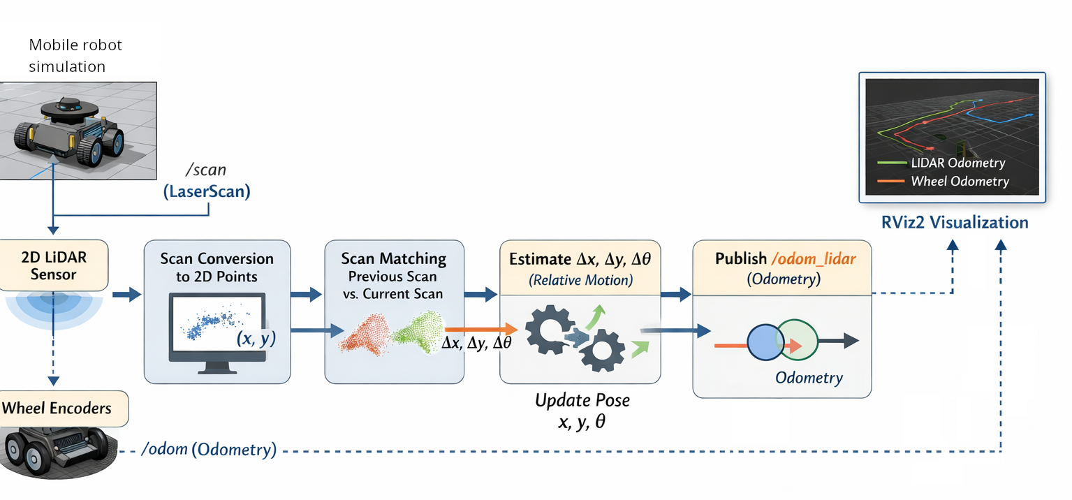 The goal of this task is to implement a basic LiDAR-based odometry system for a mobile robot. The system should estimate the robot’s motion by matching consecutive 2D LiDAR scans and compare it with wheel encoder odometry. This lab focuses on understanding scan conversion, matching, and pose estimation, and visualizing results in RViz2